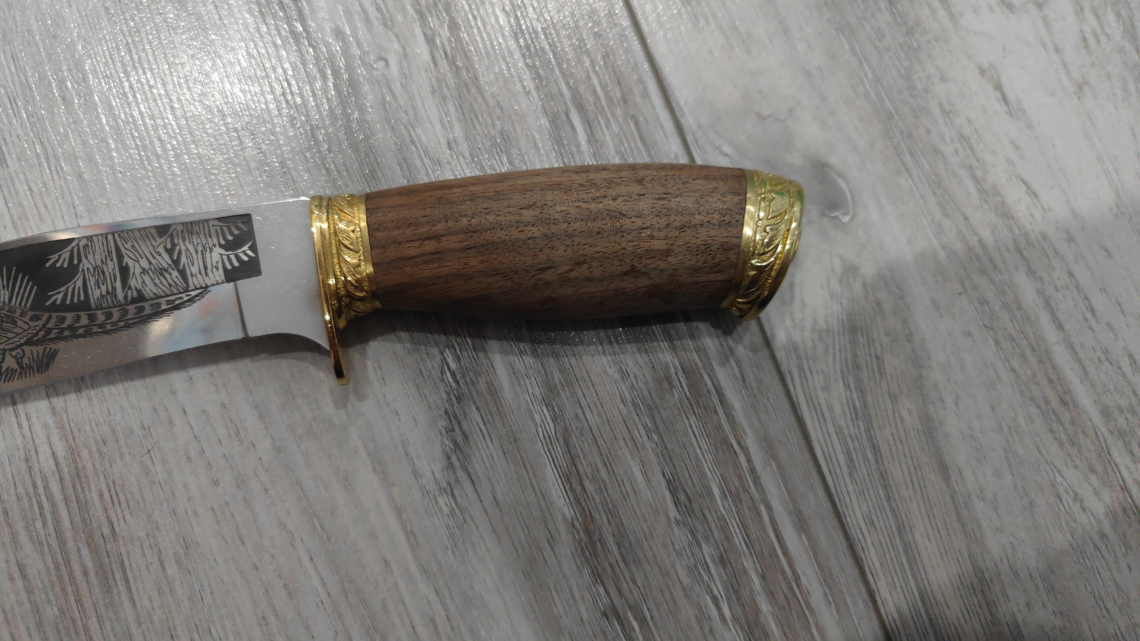 Гарда и навершие ножа выполнены из латуни с тиснением рисунка на металле, благодаря этим элементам нож имеет более привлекательный внешний вид и прекрасно подойдет в качестве подарка.